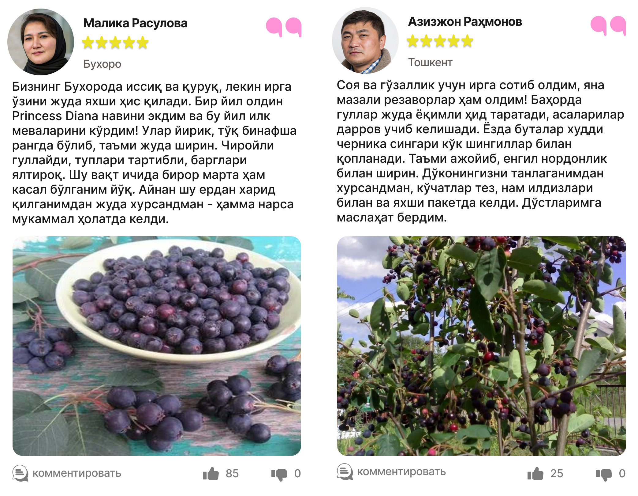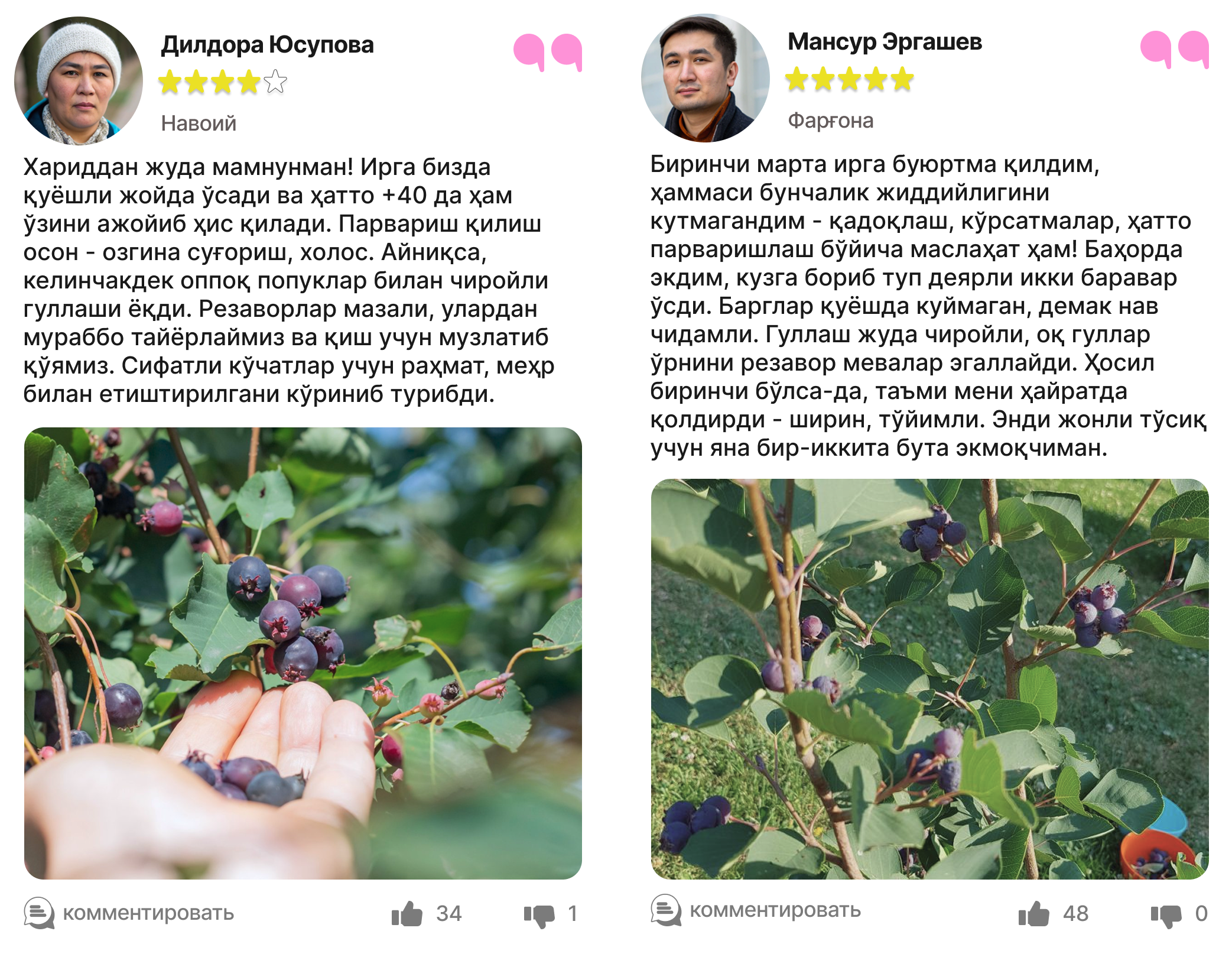 Харидорларимиз сотиб олинган ва етиштирилган ирга кўчатлари ҳақидаги таассуротлари билан ўртоқлашмоқда.