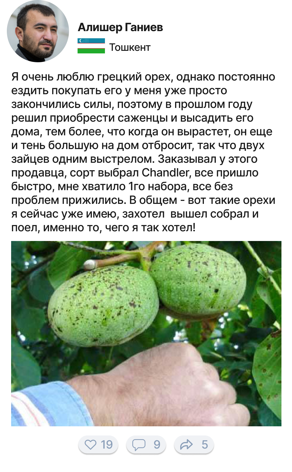 Грецкий орех — очень ценный вид дерева, и мы часто не понимаем, что растет у нас под ногами, каким богатством мы обладаем. Грецкий орех очень часто используют в производстве дорогой мебели, орех имеет очень красивый цвет и структуру дерева. Я с семьей выращиваю орехи на продажу уже более 20 лет. 5 лет назад мы начали продавать ореховые саженцы нашим клиентам и каждый раз радуемся, когда им удается вырастить собственные ореховые сады!